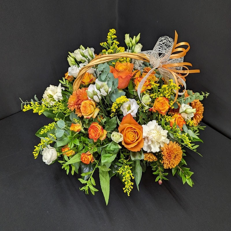 Containing a blend of orange roses and seasonal flowers, this basket captivates with its charm. Whether for a celebration or a simple gesture of kindness, it is sure to leave a lasting impression.