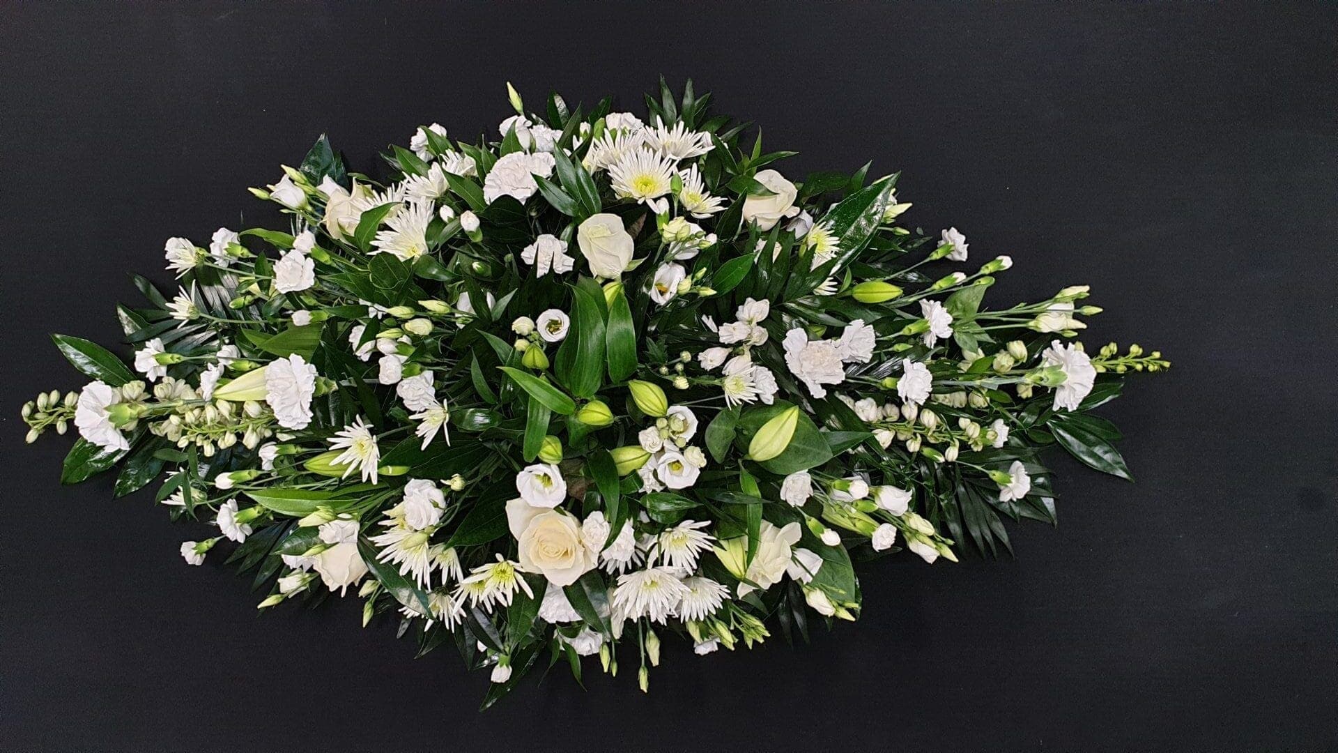 The Funeral Coffin Spray is a beautifully arranged floral tribute that conveys heartfelt sympathy and respect. Featuring pristine white lilies, roses, and chrysanthemums, it embodies elegance and serenity.