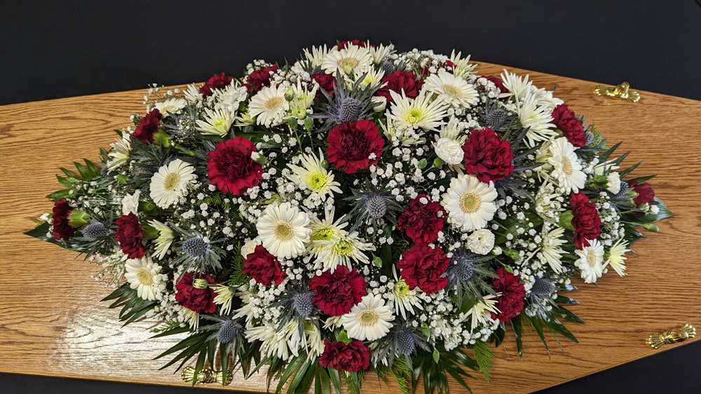 Our Funeral Coffin Spray 13 is a graceful tribute, blending rich red carnations with pristine white gerberas, set against lush greenery. Thoughtfully designed to express your heartfelt sympathies, this arrangement is crafted with elegance and care. Ideal for honouring a loved one’s memory, it provides a serene touch during times of remembrance.