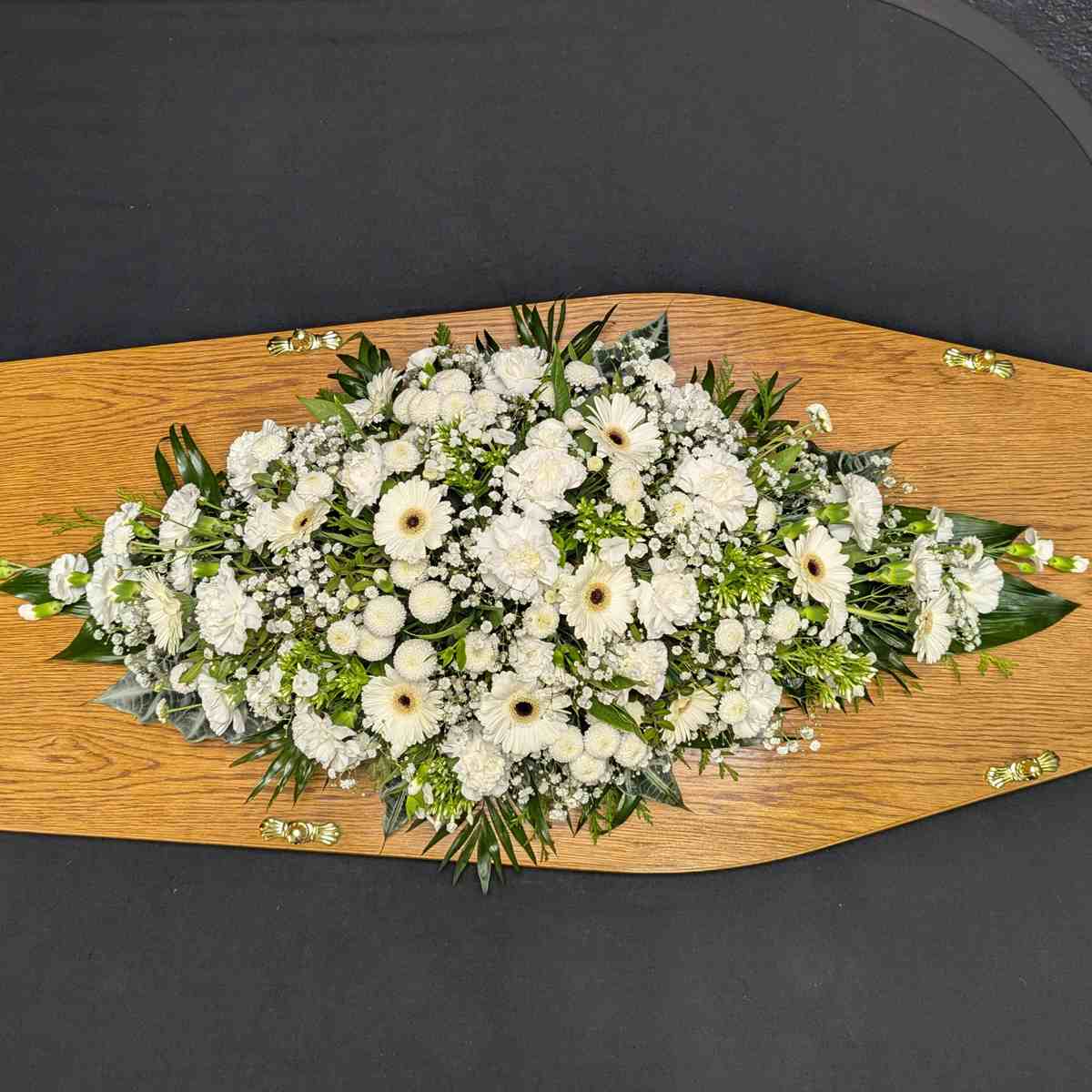 The Funeral Coffin Spray presents a touching tribute, composed of serene white flowers that symbolise peace and remembrance. This graceful arrangement is carefully designed to honour your loved one, reflecting purity and enduring love during times of sorrow.