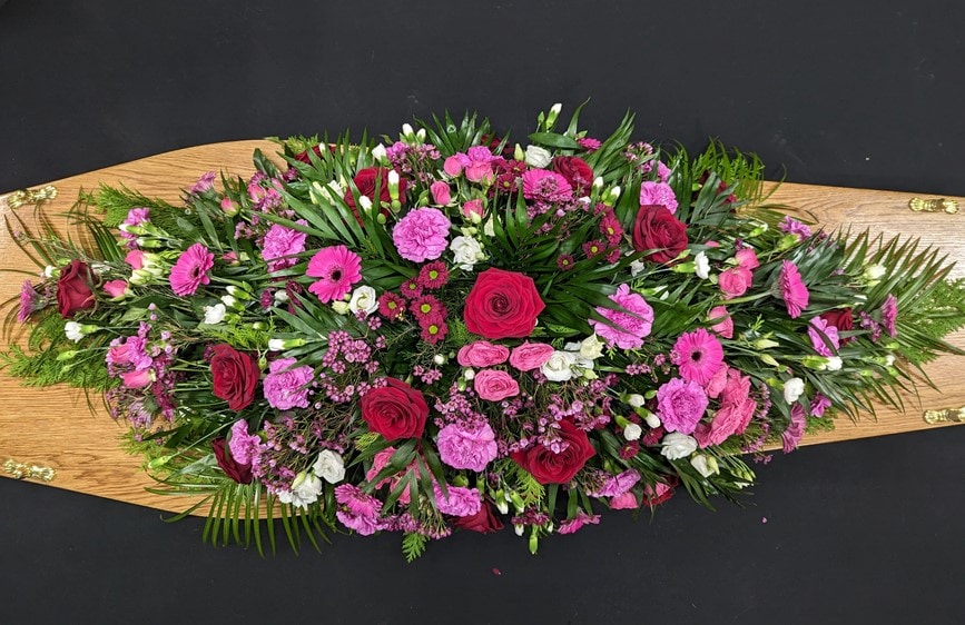 Funeral Coffin Spray, a vibrant and deeply heartfelt floral tribute designed to honour a loved one with a striking and colourful display. Hand-crafted by experienced florists at Anastasia Florists, this double-ended casket spray features a lush, passionate colour palette dominated by rich magentas, vibrant pinks, and deep red accents. The full arrangement is designed to lie gracefully across the coffin and is richly composed of beautiful flowers such as deep red Roses, bright pink Gerbera Daisies, various shades of pink Carnations, all set against a bed of abundant, contrasting green foliage.