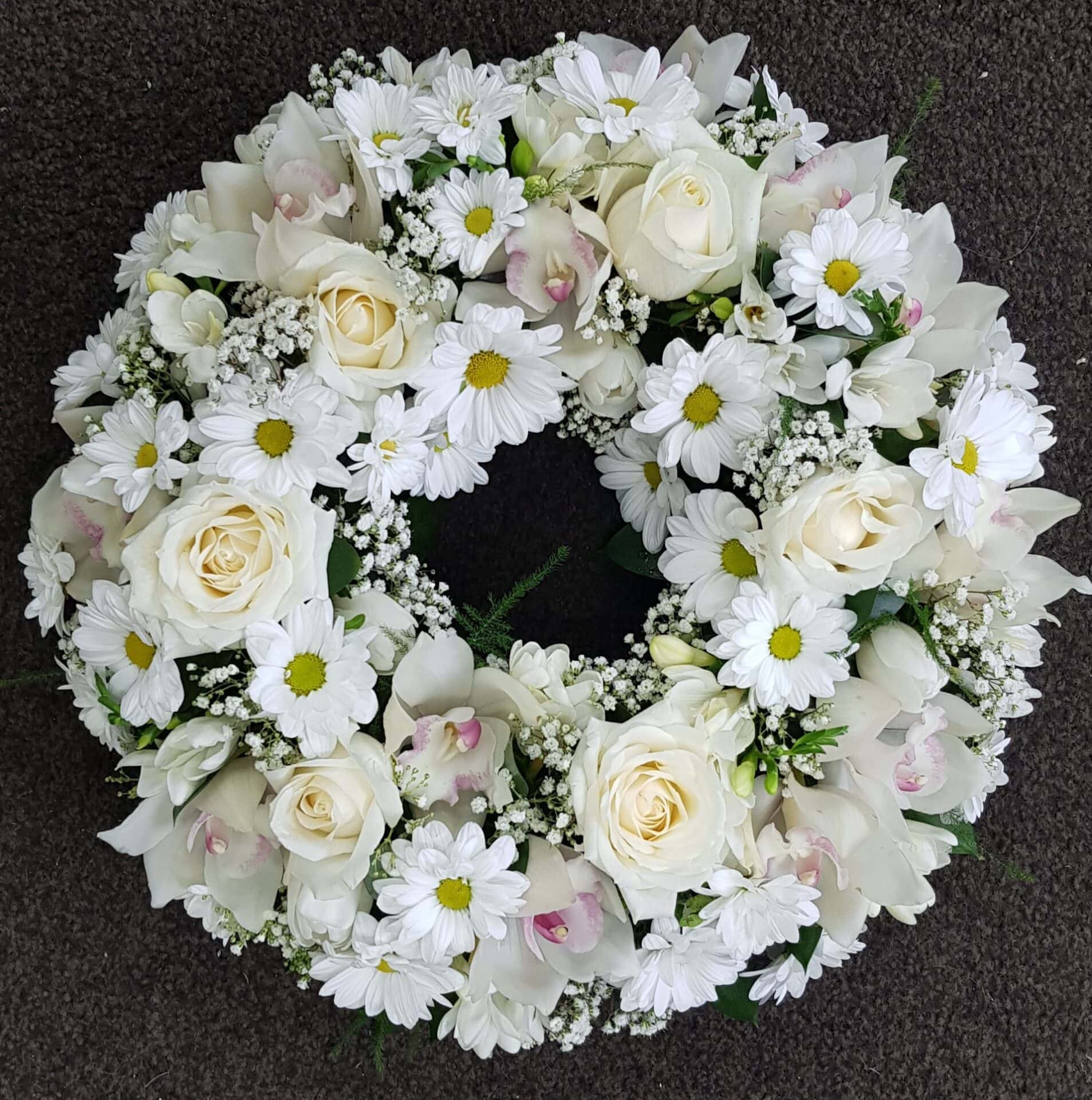 Show your support with this carefully crafted Funeral Wreath, Made using mainly White Flowers