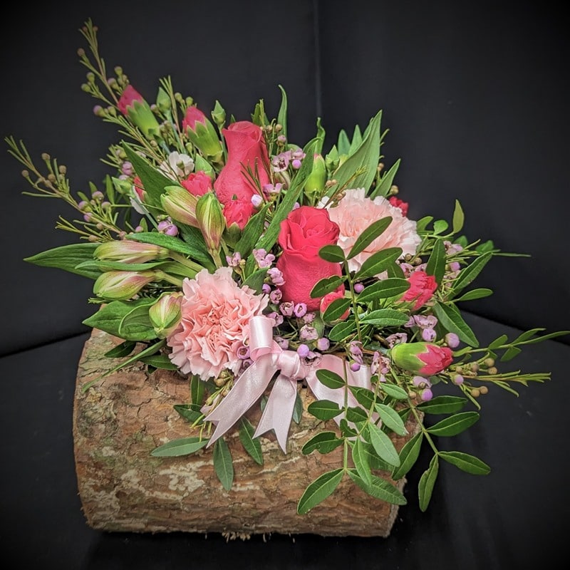 Made in our Aberdeen Flower Shop using a Pine Log with a beautifully designed Flower Arrangement in the centre of the Wooden Log.
